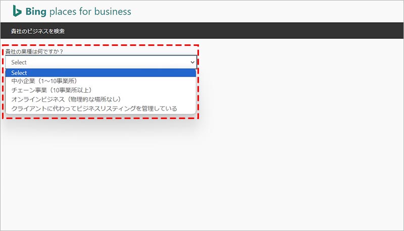 「中小企業(1~10事業所)」「チェーン事業(10事業所以上)」「オンラインビジネス(物理的な場所なし)」「クライアントに代わってビジネスリスティングを管理している」の選択肢の中から、該当するものを選択します。