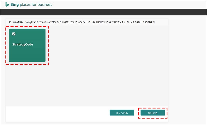対象のビジネスアカウントを選択した状態で、「続行する」をクリックします。