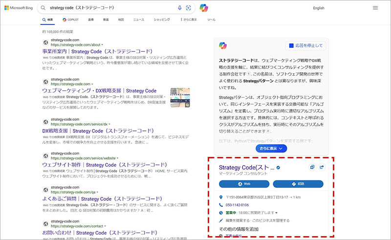 そして、表示されるマップや施設リスト、ナレッジパネルの住所をクリックすると、Bing マップに遷移します。
