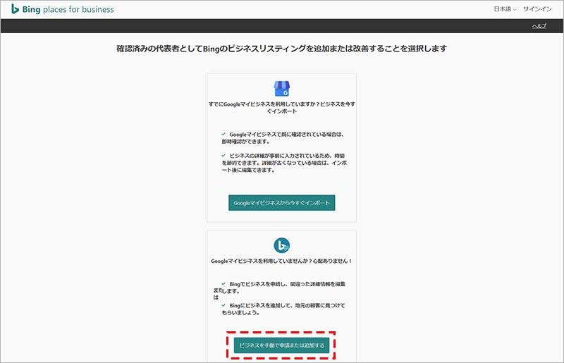 「ビジネスを手動で申請または追加する」をクリックします。