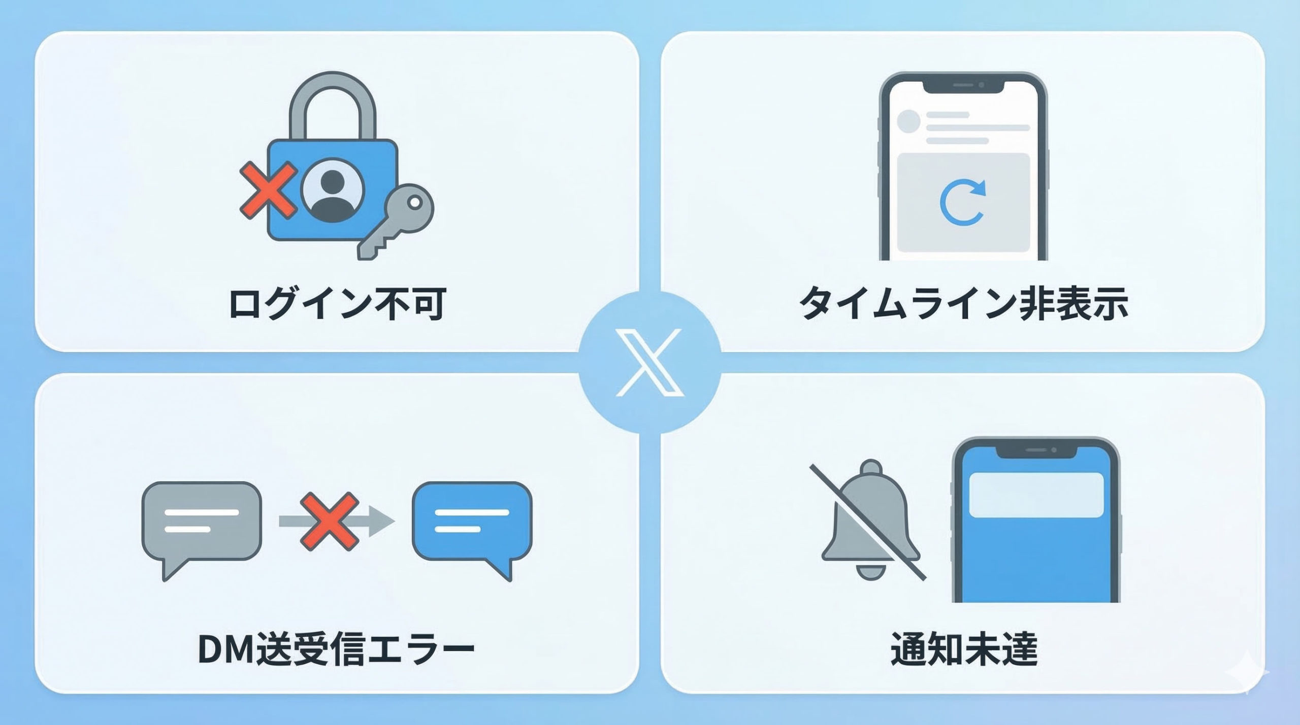 X(旧:Twitter )で頻繁に発生する不具合を理解しておくことで、いざというときに冷静に対応できます。ここでは、多くのユーザーが経験する代表的な不具合を紹介します。